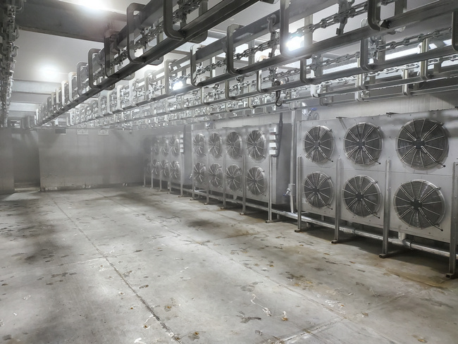 速凍冷庫(kù)通常在預(yù)冷庫(kù)之后,通常食品經(jīng)處理預(yù)冷后在速凍冷庫(kù)冷凍。