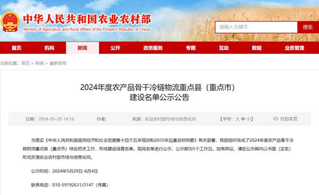 2024年度農(nóng)產(chǎn)品骨干冷鏈物流重點(diǎn)縣(重點(diǎn)市)建設(shè)名單公示公告